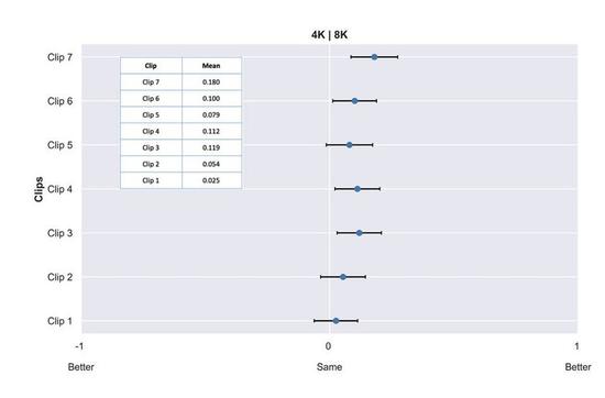 当然,两个版本的播放顺序自然是被打乱的,测试者只知道自己看到的是 A 和 B 两个版本,而不会知道哪一个是 4K,哪一个是 8K。