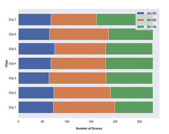 实际观看时,测试者均会看到上述 7 个片段的 4K 和 8K 版本,分别会用‘A’和‘B’来指代,用户再给出‘哪一版更好’的评价即可。