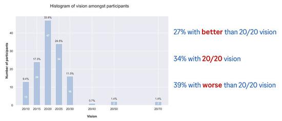 这项研究的另一个特点在于,华纳还对所有测试者进行了视力测试,用‘20/x’这样的数字来量化他们的‘视觉敏锐度’。