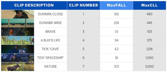 同时,华纳还展示了各个视频片段的最大内容亮度(MaxCLL),以及最大平均内容亮度(MaxFALL),基本能涵盖当下大部分主流场景。