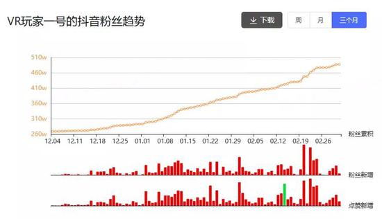 VR玩家现在全网坐拥近千万粉丝,在某平台的点赞量接近5000万。这个KOL通过VR为自己揽获近千万粉丝